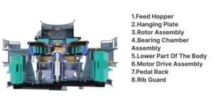The Vertical Shaft Sand Making Machine consists of seven parts: a feeding hopper, a distributor, a vortex crushing chamber, an impeller body, a main shaft assembly, a base, a transmission device, and a motor.